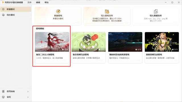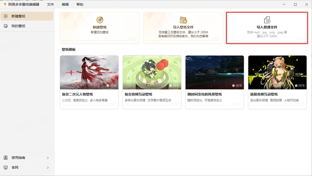 方式2:点击 “导入壁纸文件” ,在其他平台制作好的第三方壁纸文件也可以在网易多多壁纸编辑器里进行二次编辑和使用