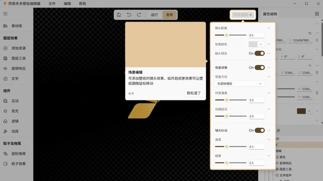 4、点击 “场景编辑” ,可添加壁纸的镜头效果,如开启视差效果可让壁纸随鼠标移动
