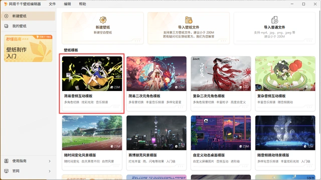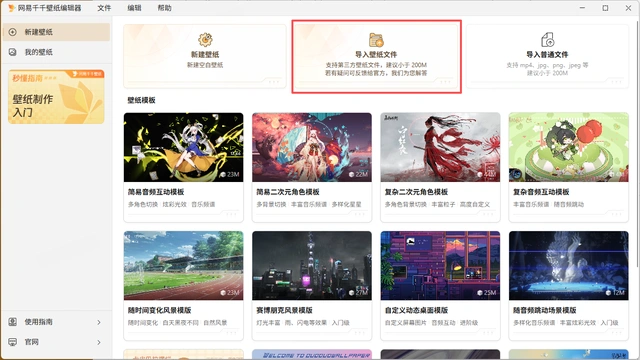 方式2:点击 “导入壁纸文件” ,在其他平台制作好的第三方壁纸文件也可以在网易千千壁纸编辑器里进行二次编辑和使用