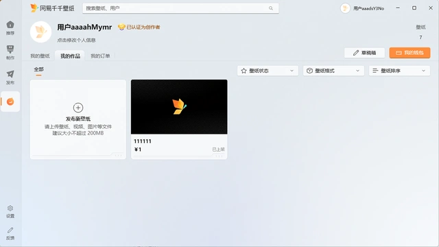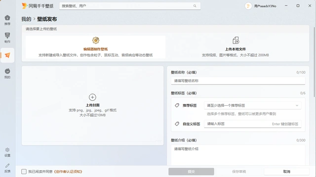 - 上传壁纸:①编辑器制作壁纸:网易千千提供了壁纸编辑器,可通过编辑器制作动态壁纸,让壁纸更好玩可互动;②上传本地文件:导入视频或图片,可直接发布成壁纸内容