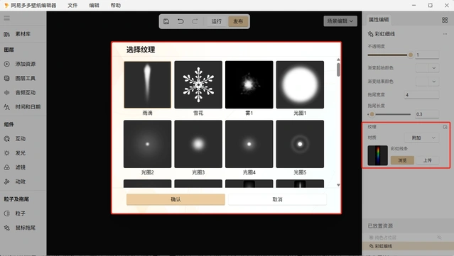 什么是简约线条鼠标拖尾?在鼠标移动的过程中,会产生线条状的鼠标轨迹,跟着壁纸使用者的鼠标移动如何添加并使用?1、点击 “鼠标拖尾-简约线条” ,选中您想要的形状,即可添加不同效果的线条鼠标拖尾2、调整不透明度、渐变起始颜色、渐变结束颜色、拖尾长度等,即可改变拖尾的实际效果3、若对于拖尾的纹理图片不满意,可点击 “浏览” 去官网提供的纹理列表里选择自己想要的纹理,或是点击 “上传” 去上传本地已有的图片当做鼠标拖尾纹理,即可生成完全不同效果的鼠标拖尾详细操作和效果可以查看视频教程