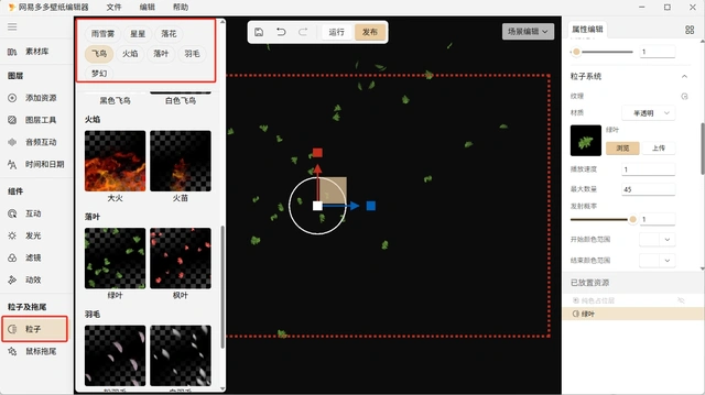 网易多多壁纸编辑器已支持有20+不同的粒子特效,覆盖雨雪雾、星星、落花、飞鸟、火焰、落叶、羽毛、梦幻等不同类型,每种类型下包含不同的粒子效果