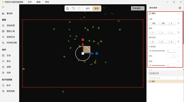 2、添加完粒子后,可以在 “属性编辑” 对粒子的属性进行调整,调整粒子的位置、旋转角度、缩放、不透明度、颜色、数量、大小、速度、生命周期、回放速度等不同参数进行调整;