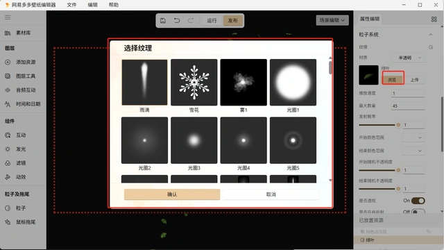 如果目前官方提供的粒子特效不符合您的预期,您可以添加不同的粒子特效,点击 “粒子系统-纹理” 里更换纹理图片,可以点击 “浏览” 去选择官方提供的更多纹理图片;或是点击上传创作者自己想要的纹理图片