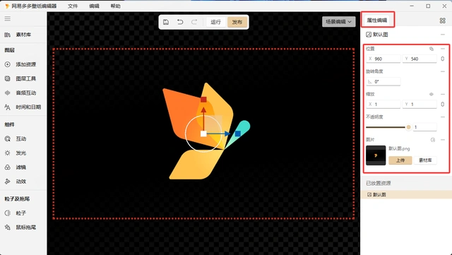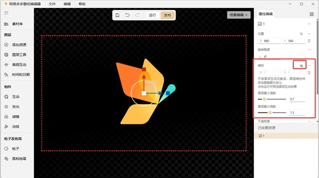 4、图片缩放支持绑定 “音频互动” ,点击 “音频互动开关” ,则后续图片的缩放大小,将随电脑播放音乐的音频输入大小变化, 您可以设置音频控制的缩放最小倍数、缩放最大倍数。最终图片的缩放倍数是原始缩放倍数和最小/最大缩放倍数 共同作用形成